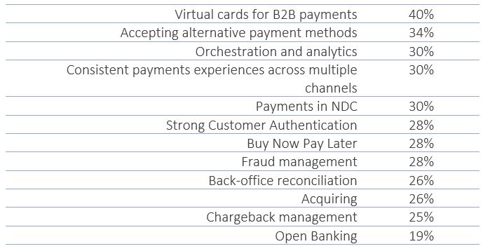 In addition to orchestration, travel payments leaders highlighted virtual cards for B2B payments, accepting alternative payment methods and delivering a consistent cross-channel payment experience as implementation priorities over the coming year. There are also a longtail of additional capabilities planned for implementation during 2024.