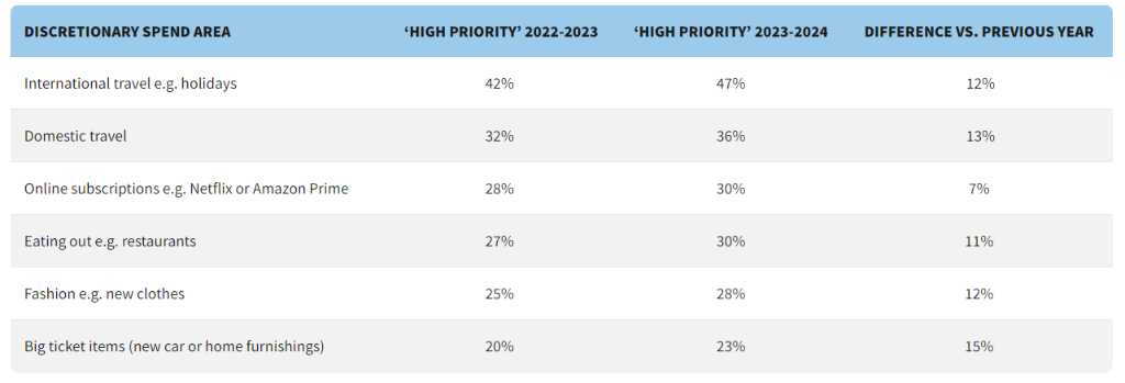 ‘International travel’ was once again ranked by consumers as the highest discretionary spend priority from a basket of six categories.